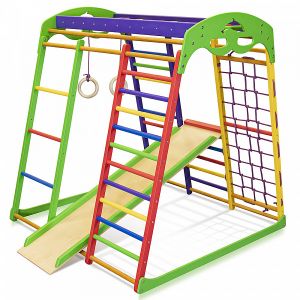 Заняття на цьому спортивному куточку сприятимуть зміцненню всіх груп м’язів, розвитку вестибулярного апарату, профілактики захворювань центральної нервової системи, розумового розвитку та оздоровлення організму в цілому. Ігрові елементи - мольберт та рахівничка привернуть увагу дитини та розвинуть її творчі та математичні здібності.