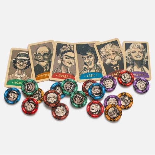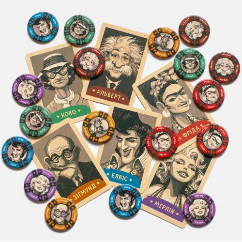 Виріб у вигляді яскравого набору з правил гри, ігрового поля, карток з символами, карток з персонажами відомих людей, ігрових монет, круглих фішок з персонажами, жетонів сили, жетонів старту для розвитку уваги, пам'яті, логіки. Гра українською мовою.