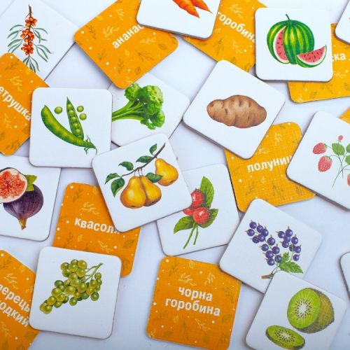 Виріб у вигляді яскравого набору з 56 карток з барвистими зображеннями фруктів, овочів, ягід для розвитку уваги, пам'яті, логіки. Гра українською мовою.