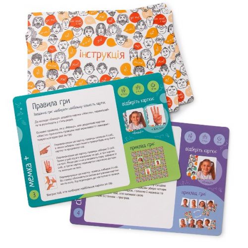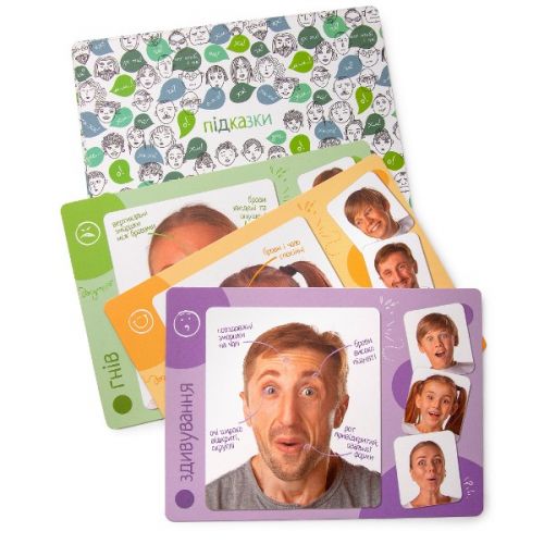 Виріб у вигляді яскравого набору з 6 психологічних ігор, 36 ігрових карток з різною мімікою, карток з поясненнями емоцій, ігрового поля для розвитку емоційного інтелекту, комунікабельності, акторських і творчих здібностей, пам'яті, фантазії. Гра українською мовою.