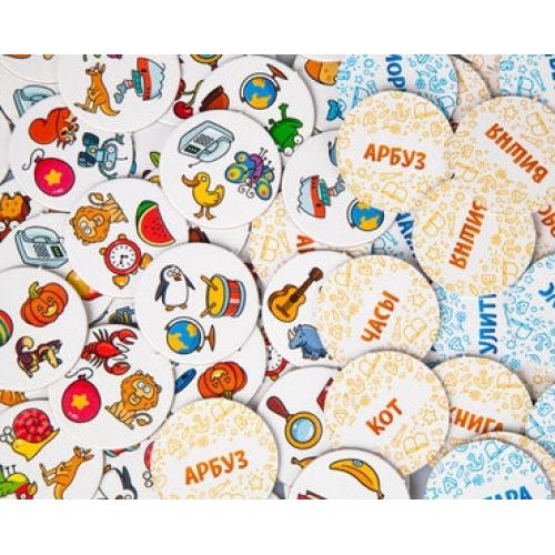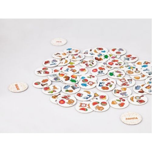 Виріб у вигляді яскравого набору з 96 фішок-жетонів з малюнками і словами, ілюстрованих правил. Для 2-5 гравців на українській мові. Гра вчить слова, читанню і швидкочитанню, розвиває логіку, мислення, увагу.