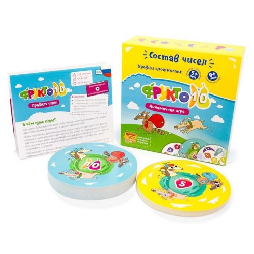 Виріб у вигляді яскравого набору з 35 карт з фруктами і цифрами для гри у «Фрукто 10», 15 карт з фруктами і цифрами для гри у «Фрукто 5», ілюстрованих правил. Для 2-5 гравців на українській мові. Гра допомагає вчити числа, додавання і віднімання, розвиває логіку, мислення, увагу.