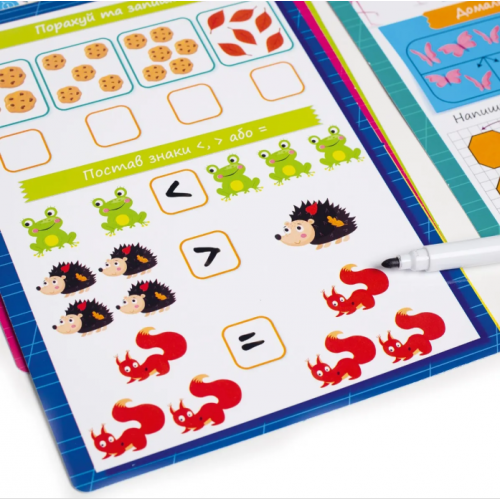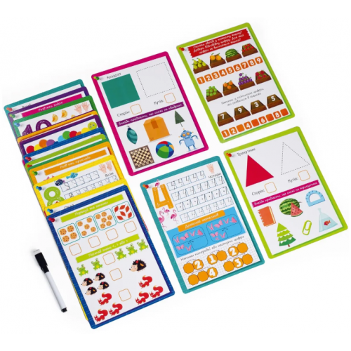 Завдяки багаторазовому маркеру цей набір дозволяє дітям багаторазово писати цифри та букви, виконувати завдання для розвитку уваги, пам'яті та логічного мислення. У наборі 20 двосторонніх карток і 70 цікавих завдань, що допомагають закріпити вивчений матеріал. Ідеальний для дітей віком 4-6 років.
