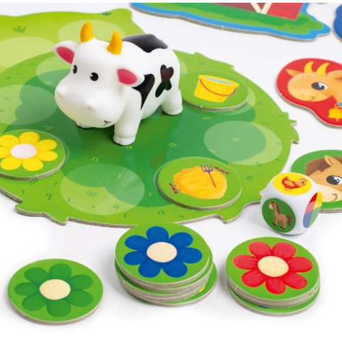 У наборі: іграшка корівка, гральне поле, 4 фігури тварин, 14 фішок, наліпки, гральний кубик, правила гри.