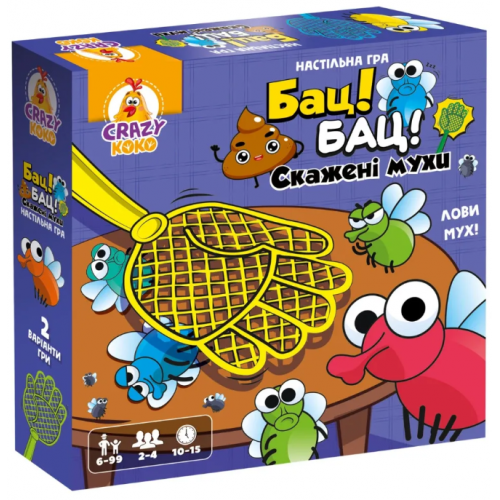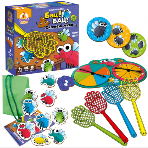 Змагайтеся з друзями, ловіть мух та ставайте чемпіоном! Легка та динамічна, гра підходить для дітей від 6 років і навіть дорослих. У комплекті все необхідне: мухобійки, мухи, колесо фортуни й навіть торбинка для мух.