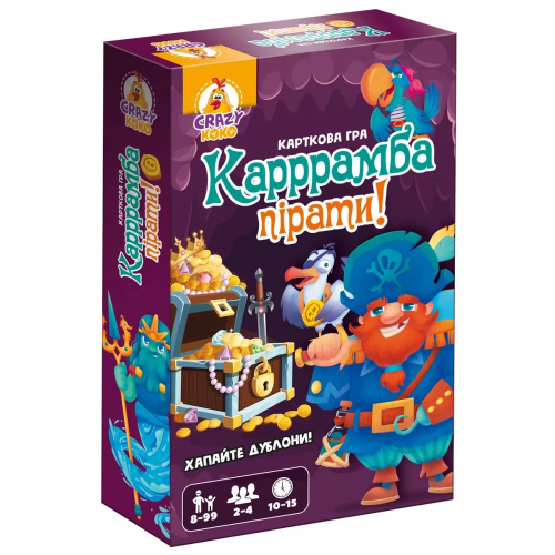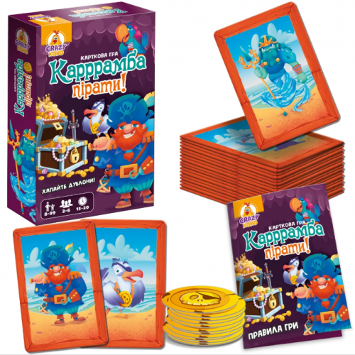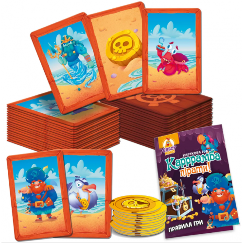 Стань справжнім піратом! Лови шанс на золото, розвивай увагу та пам'ять, кидай виклик друзям і покажи, хто править морями! Комплектація: 50 карт, 12 монет, правила. Для 2-4 гравців, вік 8-99 років. Час гри: 10-15 хвилин.