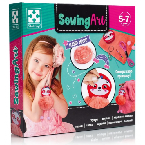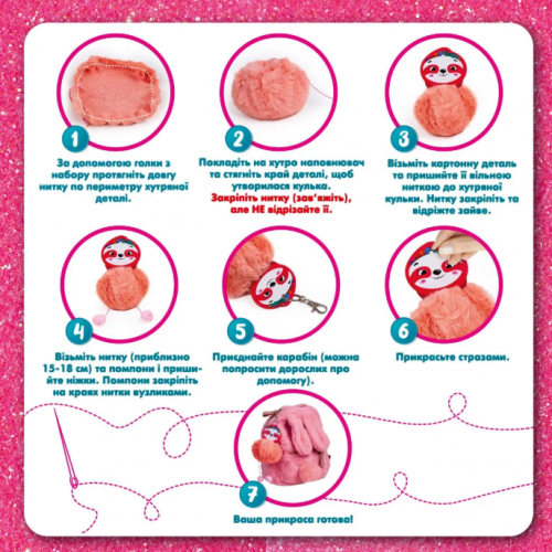 У наборі: хутро, наповнювач, картонна деталь, нитки, голка, карабін, стрази, помпони.
