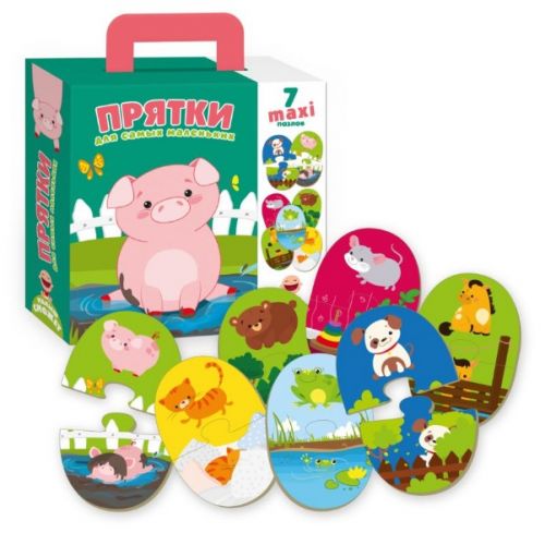 Виріб у вигляді яскравого набору з 14 великих пазлів для збирання 7 симпатичних тваринок. Гра розвиває дрібну моторику, уяву, увагу, пам'ять.