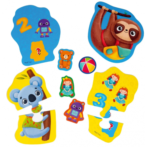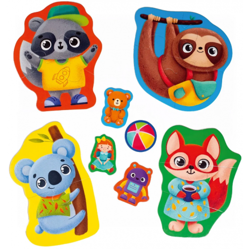 Зустрічайте єнотика, лисичку, коалу та лінивця! Веселі пазли з героями допоможуть вашим малюкам грати й навчатися одночасно. Складайте картинки, виконуйте завдання та розвивайте дрібну моторику, логіку, уважність і сприйняття форм.