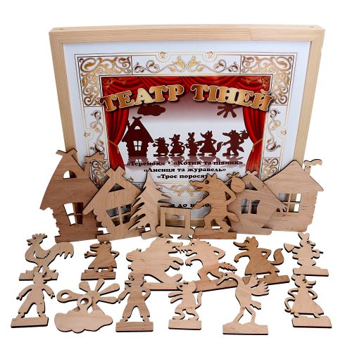 Всі деталі виготовлені з дерева, добре відшліфовані, легкі, завдяки чому іграшка є дуже зносостійкою і вічною. Набір підійде для дітей 2 до 5 років, для домашніх ігор та дошкільних закладів. Для театру потрібні стіл, настільна лампа, ширма для театра тіней, персонажі та декорації.
